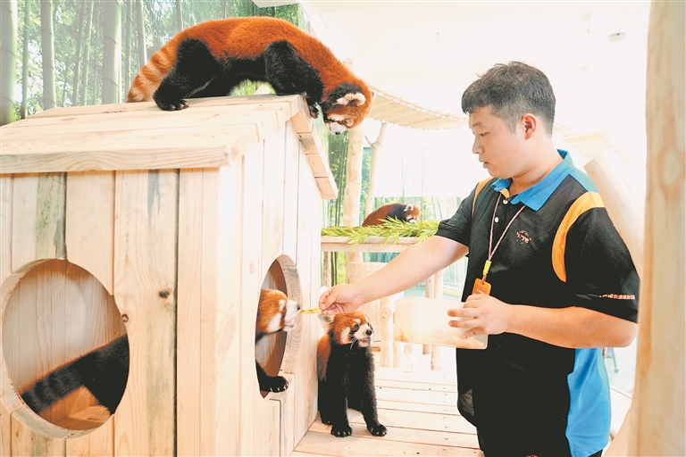 小熊貓是國家二級保護動物,野外種群數(shù)量不足萬只。保育員團隊精心準備小熊貓的飲食,專門從四川空運新鮮竹子并搭配多種營養(yǎng)餐食,確保小熊貓們健康成長。本報記者 董廣碩攝